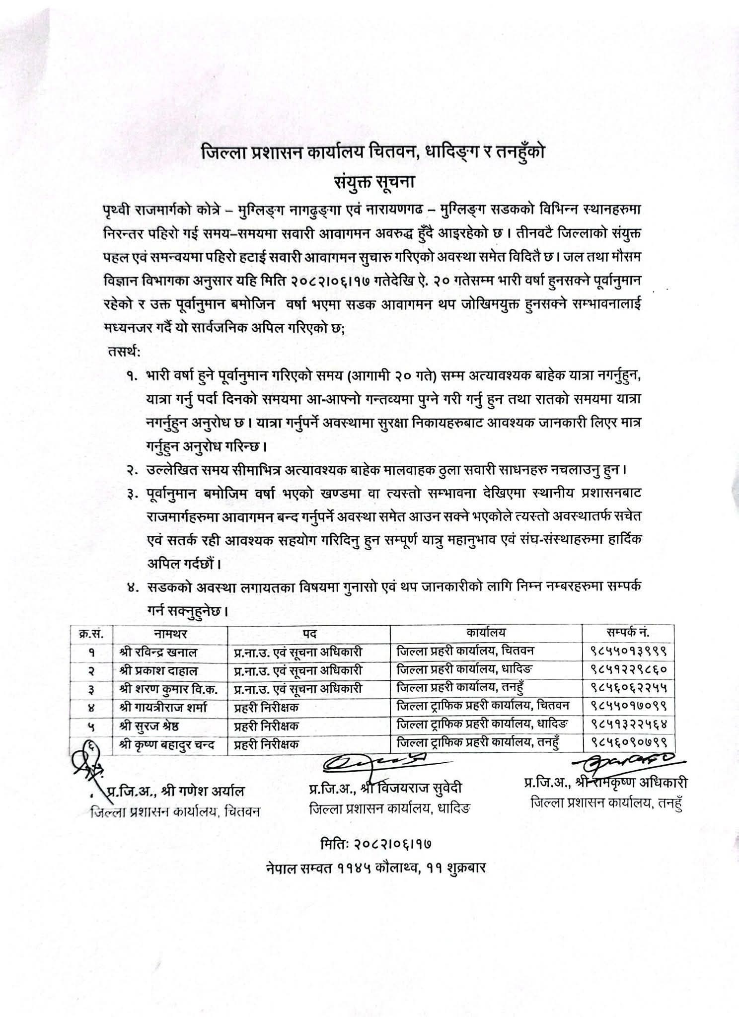काठमाण्डौ । चितवन, धादिङ र तनहुँका जिल्ला प्रशासन कार्यालयहरूले शुक्रबार संयुक्त सूचना जारी गर्दै असोज २० गतेसम्म सर्वसाधारणलाई अत्यावश्यक कारण बाहेक यात्रा नगर्न आग्रह गरेका छन्।