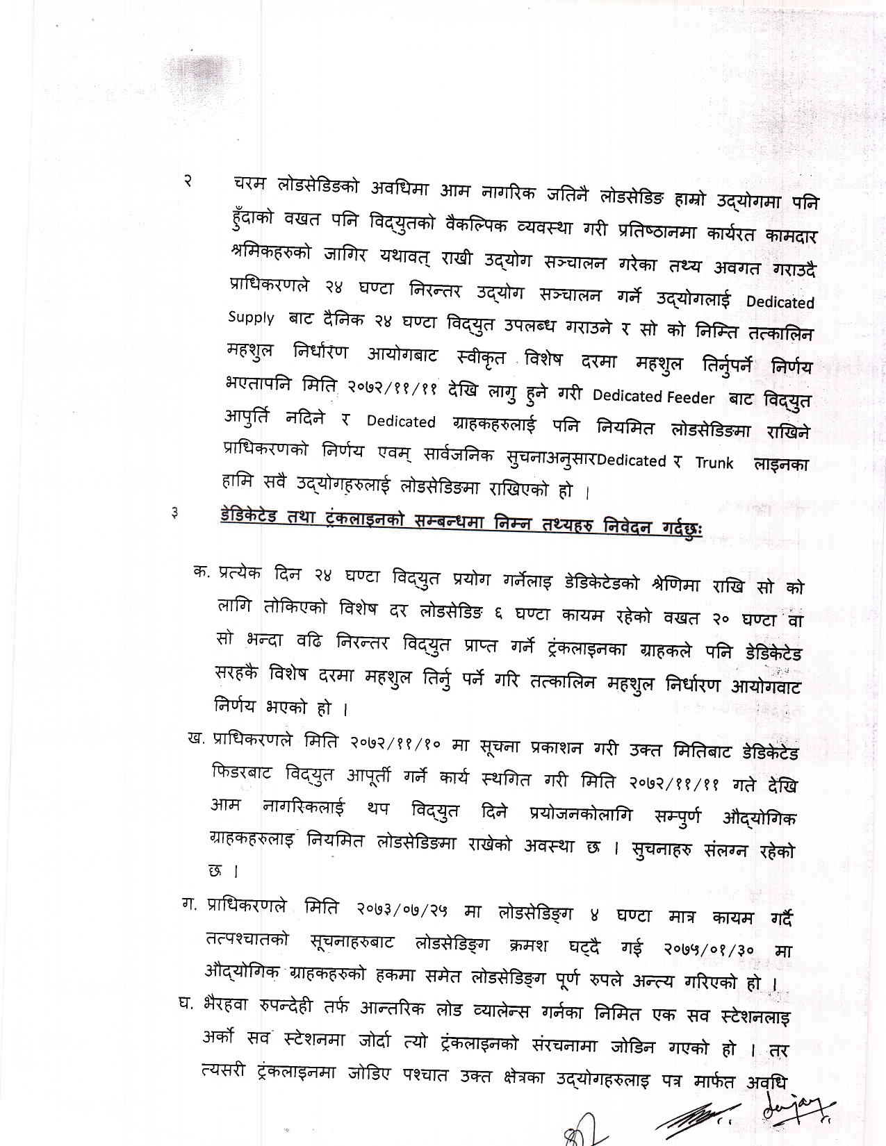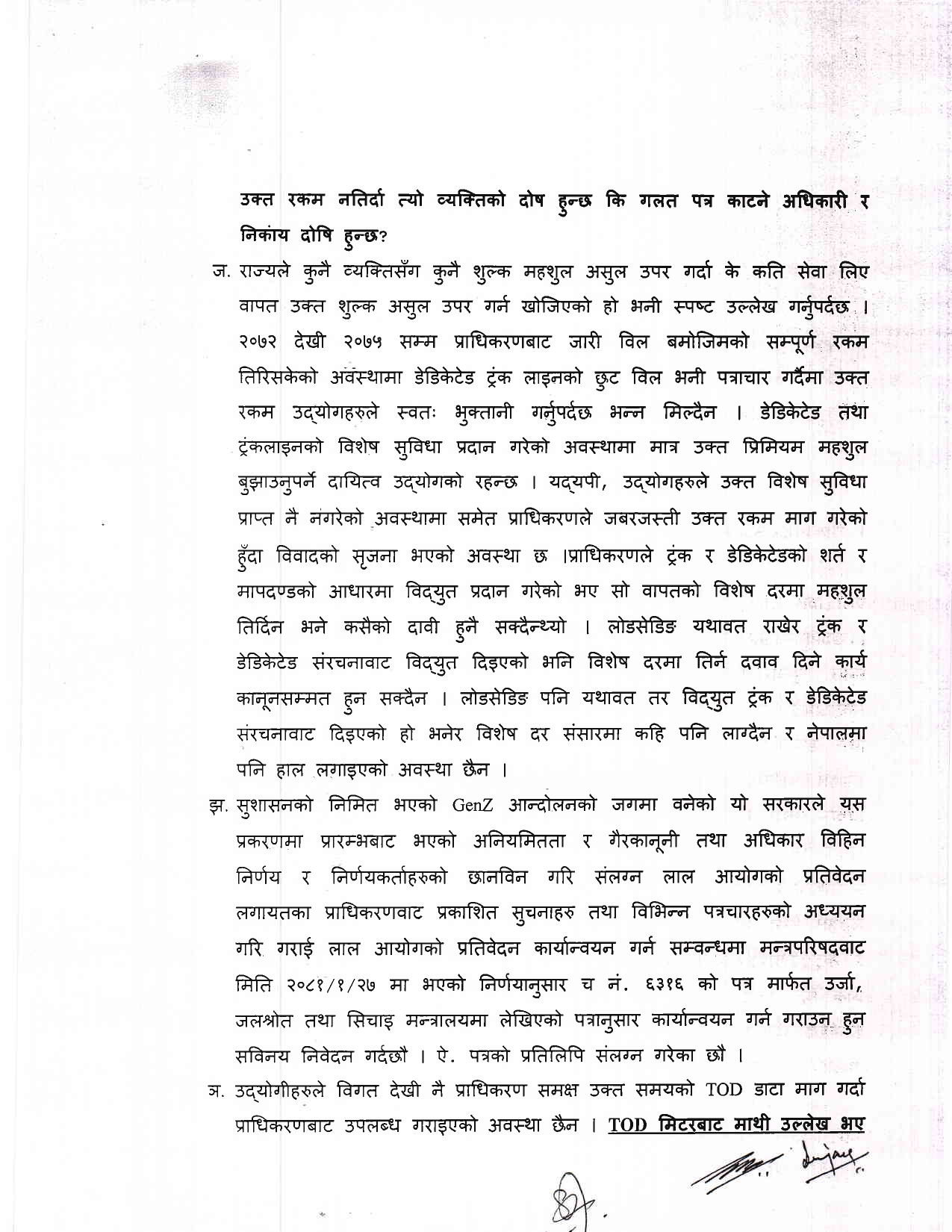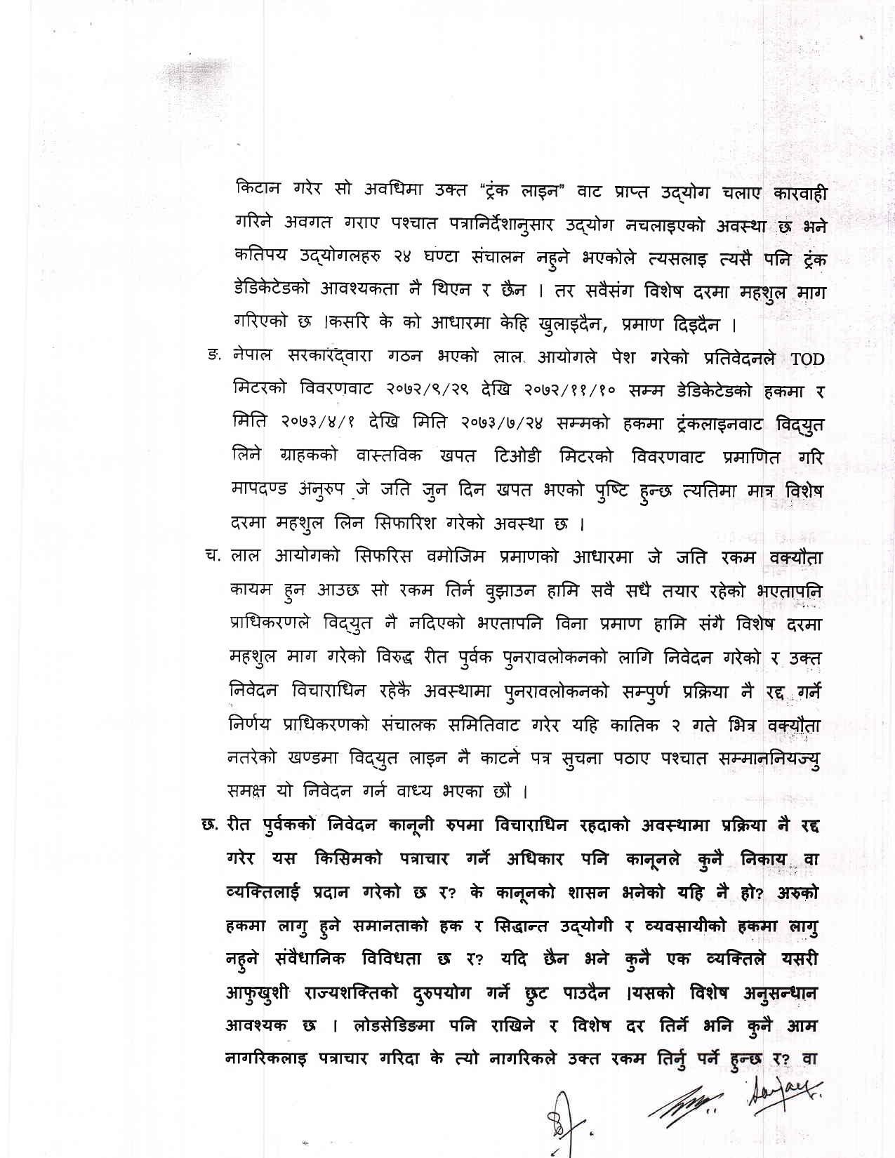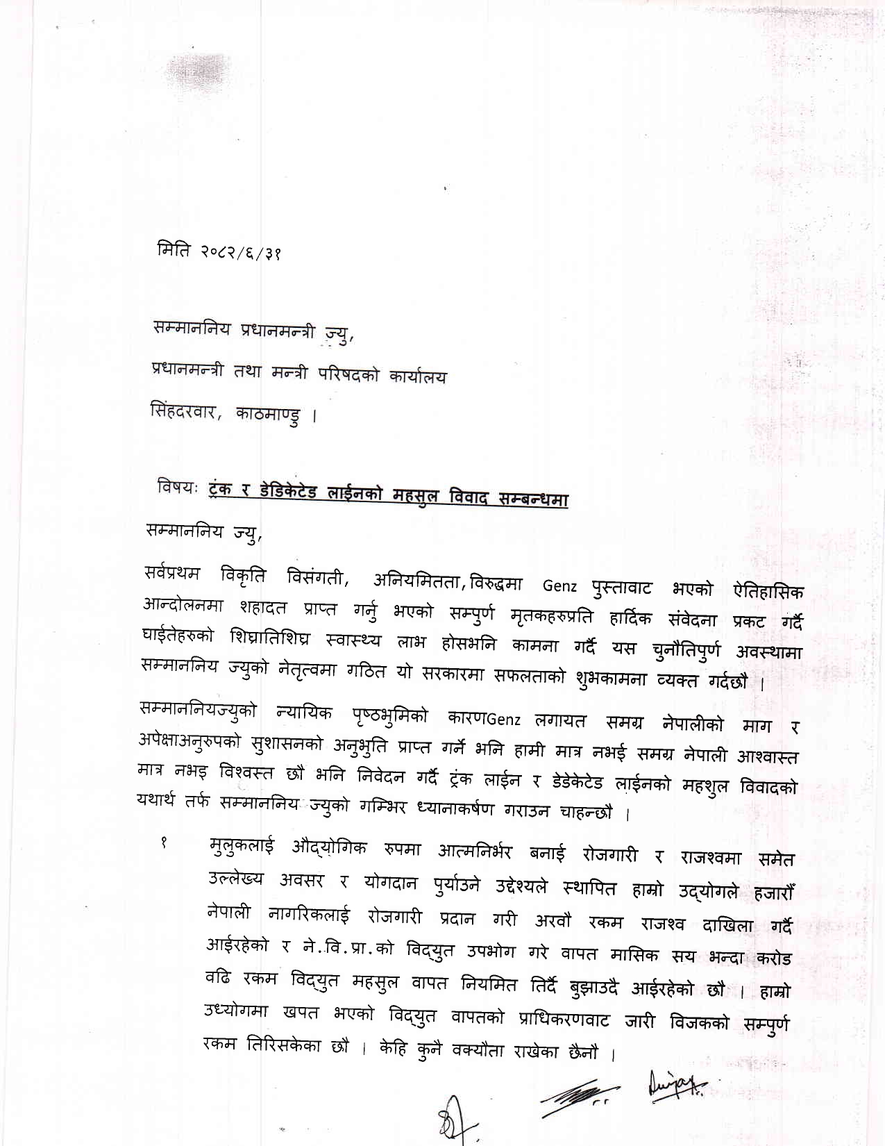 ट्रंक र डेडिकेटेड लाइन तथा फिडरबाट विद्युत प्रवाह गरेबापत विशेष शुल्क लगाउने निर्णय महसुल निर्धारण आयोगबाट नभएको महसुल निर्धारण आयोगबाट भएको निर्णय व्यहोरा परिवर्तन गरेर सोको आधारमा पत्राचार गरेको झूठो बक्यौता कायम गरेर त्यसलाई ट्रंक डेडिकेटेडको बक्यौता भनी असूल उपर गर्ने दुष्प्रयासको शिकार आफूहरु भएको र आफूहरुले कानूनको संरक्षण मात्र खोजेको समेत प्रधानमन्त्रीलाई पठाइएको पत्रमा उल्लेख छ ।