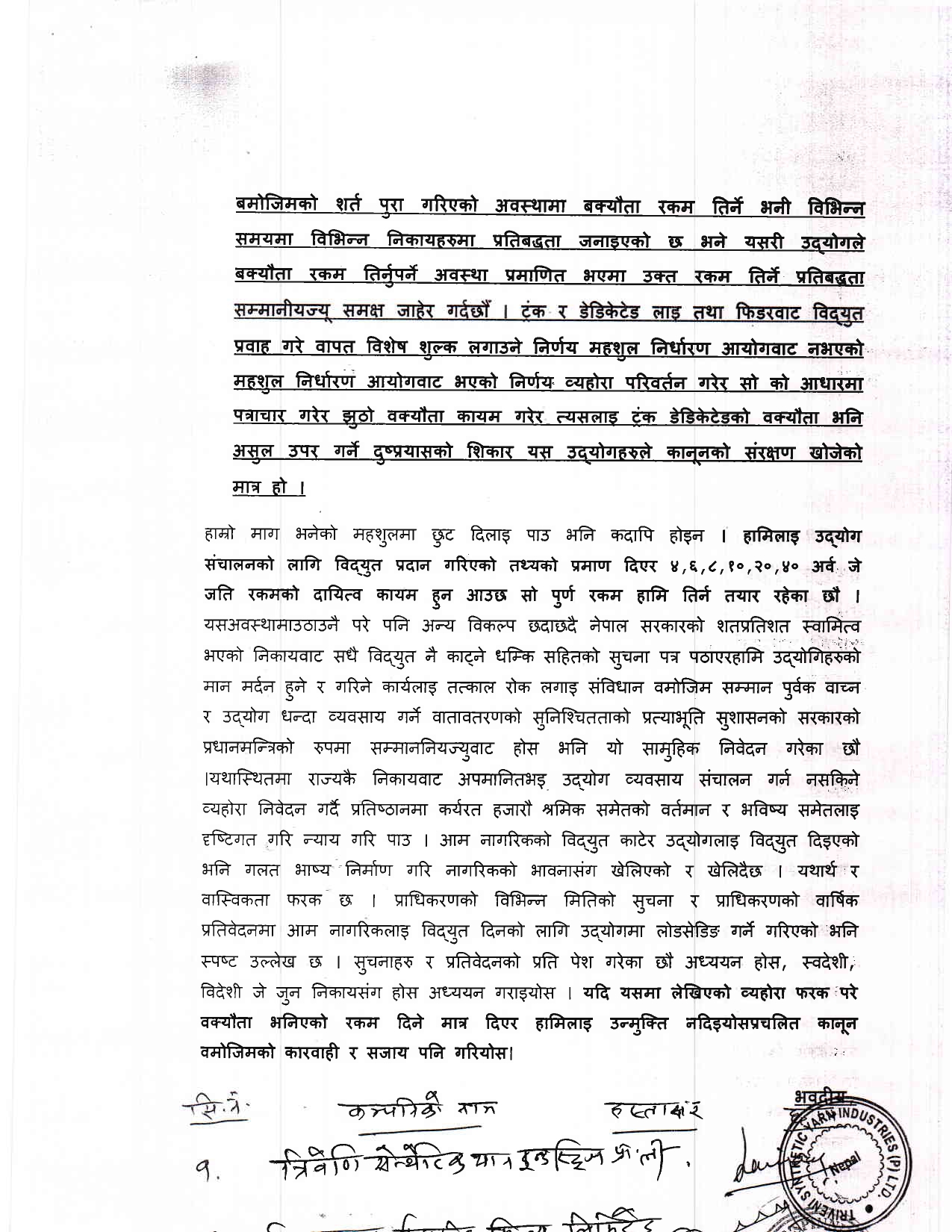 उद्योगीहरुले दिएको सामूहिक आवेदन यस्तो छः