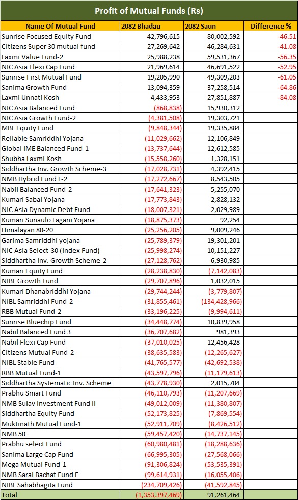 सो अवधिसम्म ७ वटा फण्डले १५ करोड ४७ लाख ५८ हजार रुपैयाँ नाफा कमाएका छन् भने ३७ फण्डले १ अर्ब ५० करोड ८१ लाख रुपैयाँ घाटा ब्यहोरेका छन् । समग्रमा म्युचुअल फण्डहरु एक अर्ब ३५ करोड रुपैयाँ घाटामा देखिएका हुन् ।