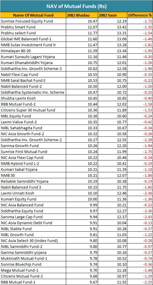 भदौ महिनासम्म ३१ वटा म्युचुअल फण्डको न्याभ १० रुपैयाँ हाराहारीमा रहेको छ भने १४ वटा म्युचुअल फण्डको न्याभ ९ रुपैयाँ हाराहारीमा रहेको छ ।