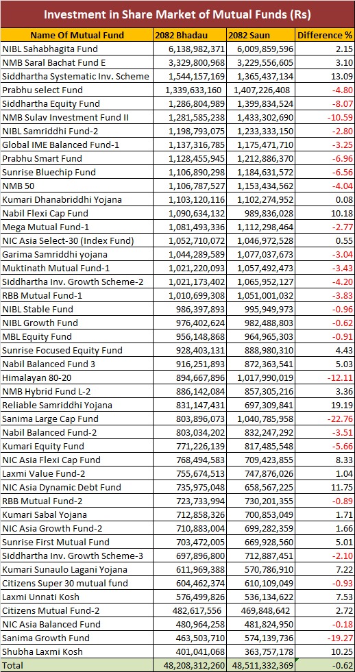 म्युचुअल फण्डहरुको सेयरबजारमा ४८ अर्ब २० करोड ८३ लाख रुपैयाँ लगानी रहेको छ । यो लगानी रकम साउन महिनाको तुलनामा ०।६२ प्रतिशत कम हो । साउनमा फण्डहरुको सेयरबजारमा ४८ अर्ब ५१ करोड रुपैयाँ लगानी रहेको थियो ।