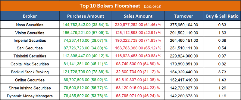 उच्च खरिद गर्ने ब्रोकरहरुमा भिजन सेक्युरिटिज, भृकुटी स्टक ब्रोकिङ कम्पनी, अनलाइन सेक्युरिटिज, श्रीकृष्ण सेक्युरिटिज र डायनामिक मनि म्यानेजर्स रहेको छ ।