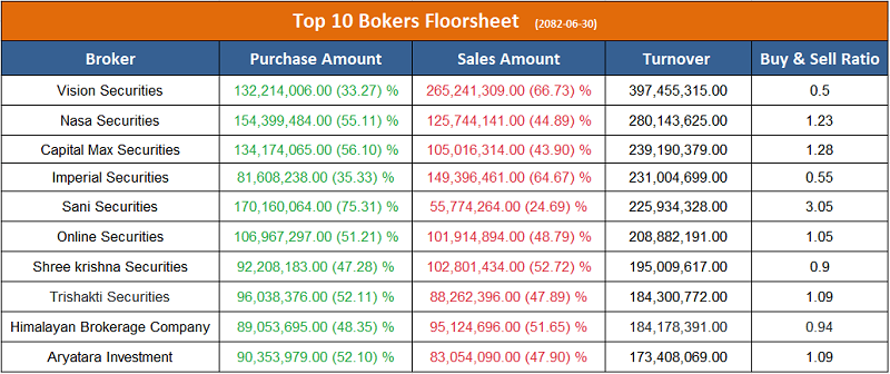 उच्च खरिद गर्ने ब्रोकरहरुमा नासा सेक्युरिटिज, क्यापिटल म्याक्स सेक्युरिटिज, सनि सेक्युरिटिज, अनलाइन सेक्युरिटिज, त्रिशक्ति सेक्युरिटिज र आर्यतारा इन्भेष्टमेन्ट एण्ड सेक्युरिटिज रहेका छन् ।