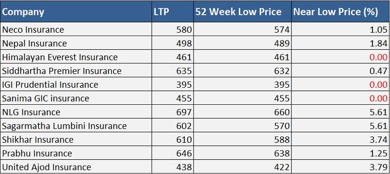 तर ५२ हप्ताकै लो प्राइस नजिक पुगेका सबै बीमा कम्पनीको सेयरभाउ हकप्रद र बोनस सेयरको मूल्य समायोजनले घटेका भने होइनन् । घट्दो सेयरबजारमा प्रायः सबै सूचीकृत कम्पनीहरुको सेयरभाउ घटेका छन् । त्यसमध्ये पनि निर्जीवन बीमा कम्पनीहरुको सेयरभाउ धेरै घटेको देखिएको छ ।