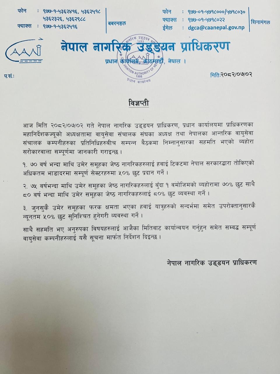 आइतबा नेपाल नागरिक उड्डयन प्राधिकरणका महानिर्देशकको अध्यक्ष बासुसेवा सञ्चालक संघका अध्यक्ष तथा नेपालका आन्तरिक बायुसेवा सञ्चालक कम्पनीका प्रतिनिधि सम्मिलित बैठकले जेष्ठ नागरिक र फरक क्षमता भएकालाई हवाई टिकटमा भारी छुट दिने निर्णय गरेको हो ।