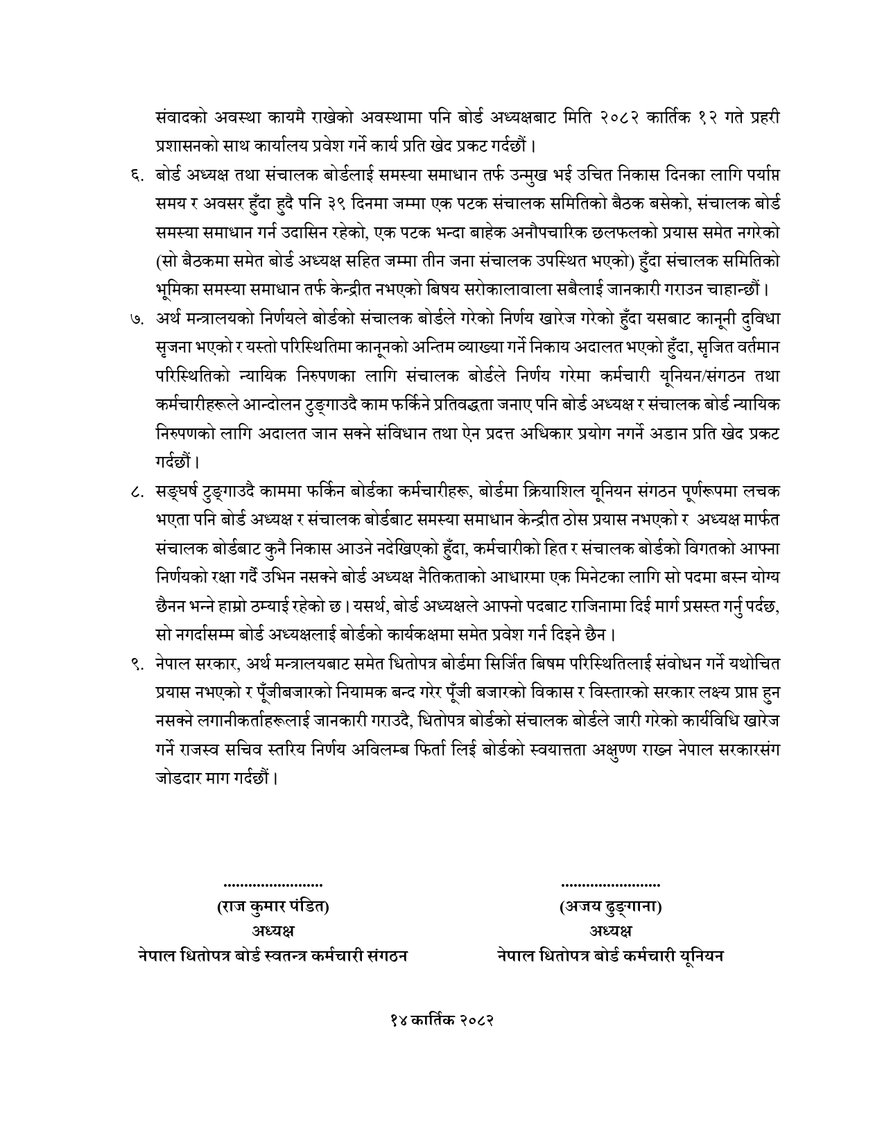 कर्मचारीहरुले बोर्ड अध्यक्ष श्रेष्ठले राजीनामा नदिएसम्म आन्दोलनको अन्त्य नहुने र उनलाई बोर्डमा प्रवेश गर्न समेत नदिने घोषणा गरेका छन् ।
