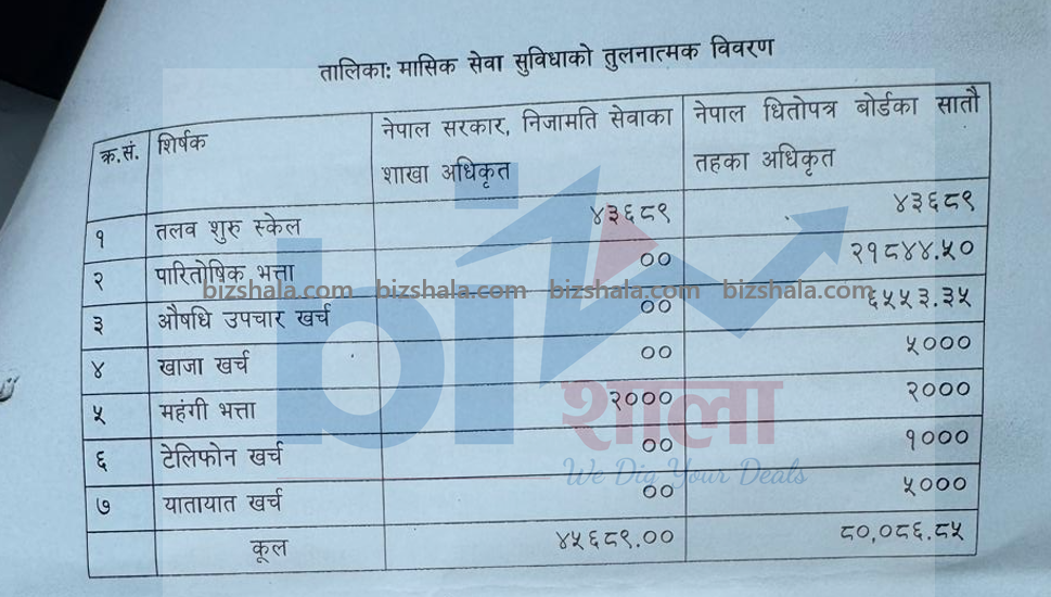 अख्तियारका अनुसार नेपाल सरकार, निजामति सेवाका शाखा अधिकृतको कुल मासिक सेवासुविधा ४५ हजार ६८९ रुपैयाँ रहेको छ । जब कि धितोपत्र बोर्डको सोही स्तरमा कार्यरत कर्मचारीको मासिक सेवासुविधा चाहिँ ८० हजार ८६ रुपैयाँ रहेको देखिन्छ ।