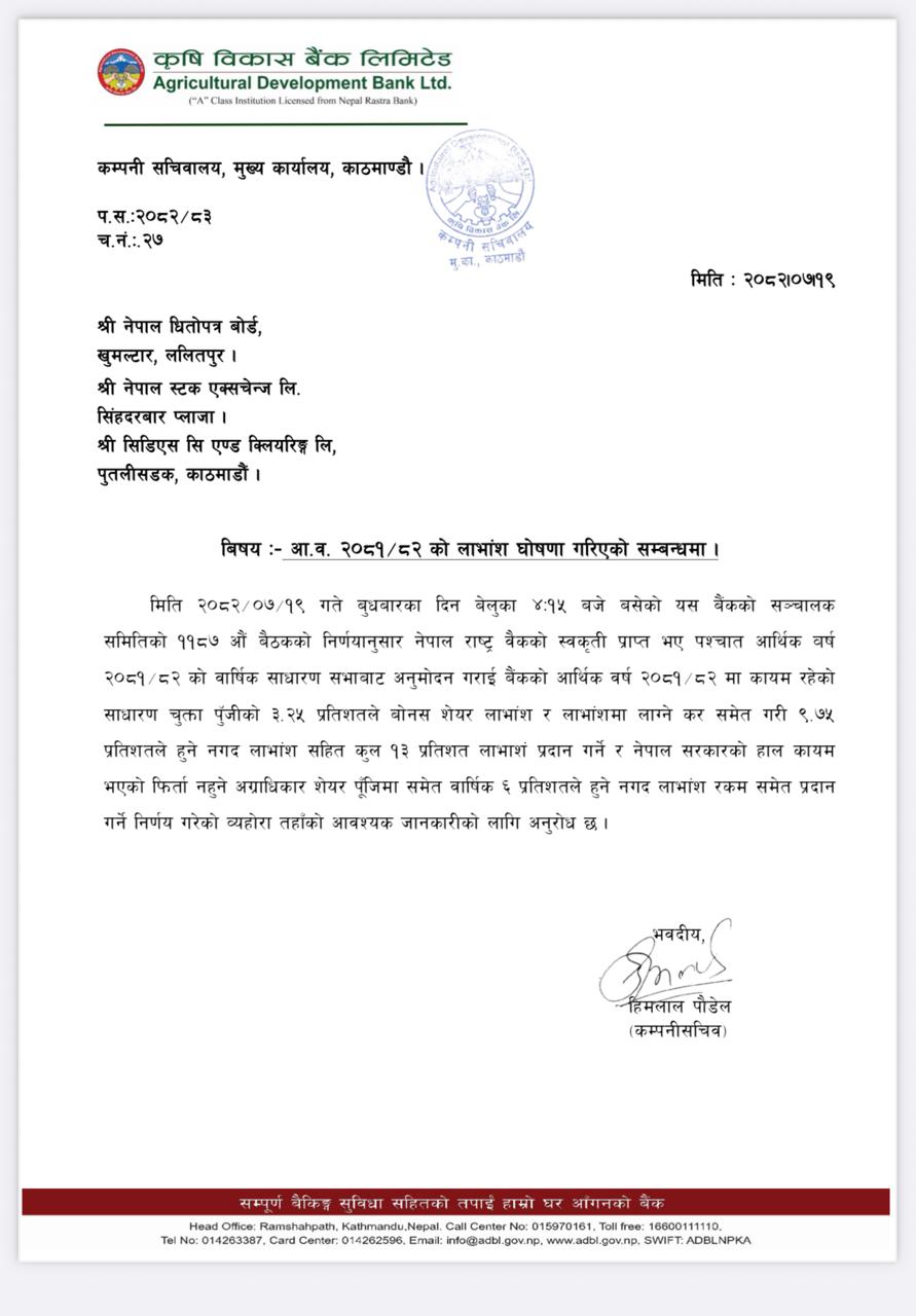 काठमाण्डौ । कृषि विकास बैंकले लाभांश घोषणा गरेको छ ।