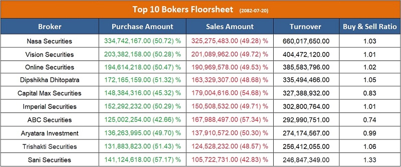 उच्च खरिद गर्ने ब्रोकरहरुमा नासा सेक्युरिटिज, भिजन सेक्युरिटिज, अनलाइन सेक्युरिटिज, दिपशिखा धितोपत्र कारोबार कम्पनी, इम्पेरियल सेक्युरिटिज, त्रिशक्ति सेक्युरिटिज र सनि सेक्युरिटिज रहेका छन् ।