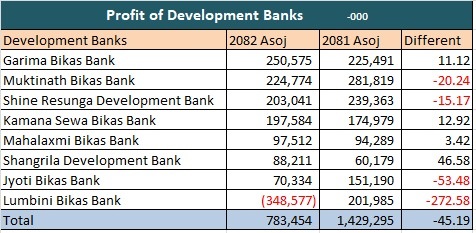 ८ विकास बैंकमध्ये लुम्बिनी विकास बैंकले सो अवधिसम्म ३४ करोड ८५ लाख रुपैयाँ घाटा ब्यहोर्दा विकास बैंकहरुको समग्र नाफा घट्न पुगेको देखिन्छ ।