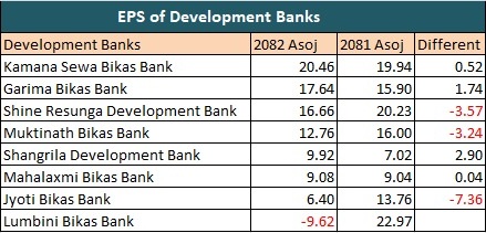 करपछिको नाफालाई कुल सेयर संख्याले भाग गर्दा आउने प्रतिफललाई नै प्रतिसेयर आम्दानी भनिन्छ । यो सूचकले कम्पनीको मुनाफा आर्जनको क्षमता देखाउने हुँदा कम्पनीको आधारभुत पक्षको विश्लेषणको प्रमुख सूचकको रुपमा लिइन्छ । राष्ट्रिय स्तरका ८ विकास बैंकमध्ये ७ वटाको इपीएस धनात्मक रहेको छ भने लुम्बिनी विकास बैंकको इपीएस ९.६२ रुपैयाँ ऋणात्मक छ । साथै तीन बैंकको इपीएस गत आवको तुलनामा घटेको छ भने चार बैंकको बढेको छ ।