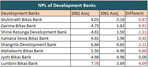 राष्ट्रिय स्तरका विकास बैंकहरु सबैको निस्क्रिय कर्जा अनुपात (एनपीएल)बढेको छ ।