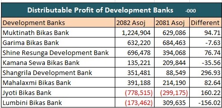 बैंकहरुले प्रकाशित गरेको वित्तीय विवरणअनुसार दुई विकास बैंकको वितणयोग्य मुनाफा ऋणात्मक देखिएको छ । बैंकहरुले विवरणमा खुद मुनाफाको केही प्रतिशत रकम वितरणयोग्य मुनाफा भनेर छुट्याएका हुन्छन् ।