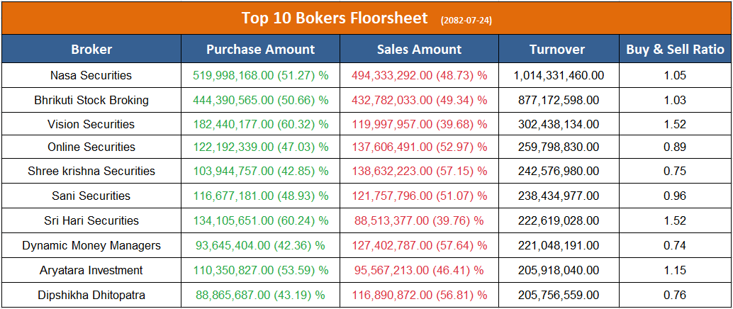 उच्च खरिद गर्ने ब्रोकरहरुमा नासा सेक्युरिटिज, भृकुटी स्टक ब्रोकिङ कम्पनी, भिजन सेक्युरिटिज, श्रीहरि सेक्युरिटिज र आर्यतारा इन्भेष्टमेन्ट एण्ड सेक्युरिटिज रहेका छन् ।