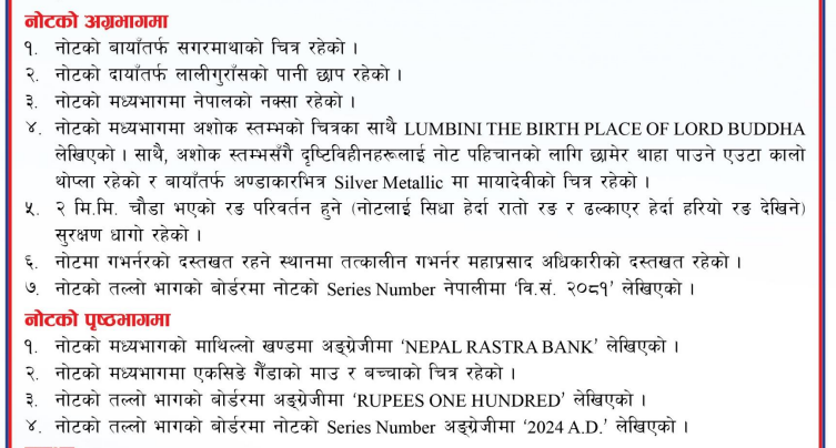 साबिककै आकार र रंगमा संकेत नम्बर क २००००००१ देखि घ ४०९९९९९९ सम्म नेपाल सरकारको जमानत प्राप्त यसको रुपैयाँ भुक्तानी माग्न आएमा नेपाल राष्ट्रबैंकबाट रुपैयाँ १०० रुपैयाँ एकसय तुरुन्त पाइनेछ भन्ने प्रतिज्ञामूलक वाक्यांशसहित देहायबमोजिमका विशेषता भएको नोट चलनचल्तीमा आउन लागेको सूचनामा उल्लेख छ ।