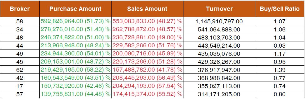 उच्च खरिद गर्ने ब्रोकरहरुमा नासा सेक्युरिटिज, भिजन सेक्युरिटिज, त्रिशक्ति सेक्युरिटिज पब्लिक लिमिटेड, अनलाइन सेक्युरिटिज र क्यापिटल म्याक्स सेक्युरिटिज रहेका छन् ।