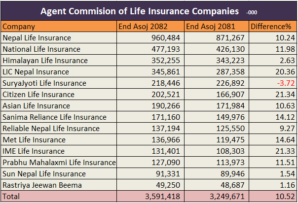 यस्तै, लाइफ इन्स्योरेन्स कर्पोरेशन (एलआइसी) नेपालले पनि यस्तो खर्च २०.३६ प्रतिशत बढाएर ३४ करोड ५८ लाख रुपैयाँ पुर्याएको छ । समिक्षा अवधिमा मेट लाइफको अभिकर्ता कमिशन १४.६४ प्रतिशत, सानिमा रिलायन्सको १४.१२ प्रतिशत, प्रभू महालक्ष्मीको ११.५१ प्रतिशत, एशियनले १०.६३ प्रतिशत, रिलायवल नेपालको ९.२७ प्रतिशत, हिमालयन लाइफको २.६३ प्रतिशत, सन नेपाल लाइफको १.५४ प्रतिशत र राष्ट्रिय जीवन बीमा कम्पनीको १.१६ प्रतिशत वृद्धि भएको देखिन्छ ।