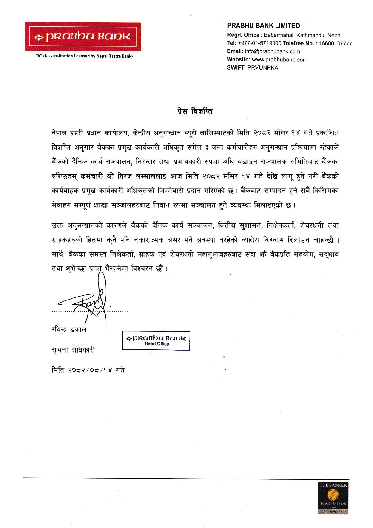 अध्यक्ष कार्कीले बैंकका आम निक्षेपकर्ता, सेयरधनी, ग्राहकलाई ढुक्क रहन र बैंक पूर्ववतः अवस्थामै सञ्चालन हुनेमा विश्वस्त रहन समेत अपील गरेका छन् ।