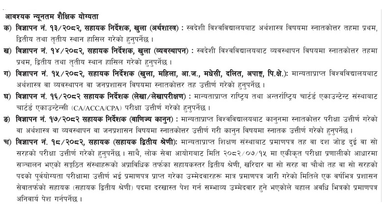 जसमा अधिकृत तृतीयअन्तर्गत सहायक निर्देशक(अर्थशास्त्र) १ जना, सहायक निर्देशक (व्यवस्थापन)१ जना, सहायक निर्देशक ३९ जना, सहायक निर्देशक(लेखा/लेखापरीक्षण)१० जना, सहायक निर्देशक(वाणिज्य कानून)४ जना र सहायक द्वितीयअन्तर्गत २१ जना सहायक माग गरिएको छ ।