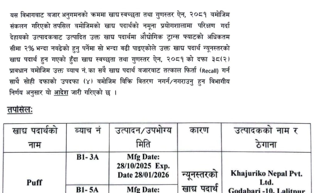 काठमाण्डौ । कृषि तथा पशुपन्छी विकास मन्त्रालय अन्तर्गतको खाद्य प्रविधि तथा गुण नियन्त्रण विभागले खजुरीको नेपाल प्रालिद्वारा उत्पादित ‘पफ’ बजारबाट तत्काल फिर्ता लिन निर्देशन दिएको छ । विभागले मंसिर १९ गते एक सूचना जारी गर्दै यस्तो निर्देशन दिएको हो ।