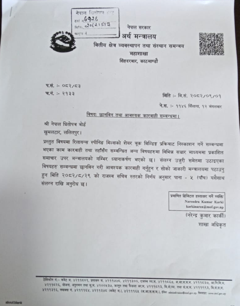 'रिलायन्स स्पिनिंग मिल्सको सेयर बुक बिल्डिंग प्रक्रियाबाट निश्कासन गर्ने सम्बन्धमा भएका काम कारबाही तथा तहाँसँग सम्बन्धित अन्य विषयहरुमा विभिन्न सञ्चारमाध्यममा प्रकाशित समाचार उपर मन्त्रालयको गम्भीर ध्यानाकर्षण भएको छ ।' पत्रमा भनिएको छः 'संलग्न उजुरी समेतमा उठाइएका विषयहरु सम्बन्धमा छानबिन गरी आवश्यक कारबाही गर्नुहुन र सोको जानकारी मन्त्रालयमा पठाउनुहुन मिति २०८२ ०८ २९ को राजश्व सचिवस्तरको निर्णयअनुसार पाना ५(पाँच) यसैसाथ संलग्न राखी अनुरोध छ ।'