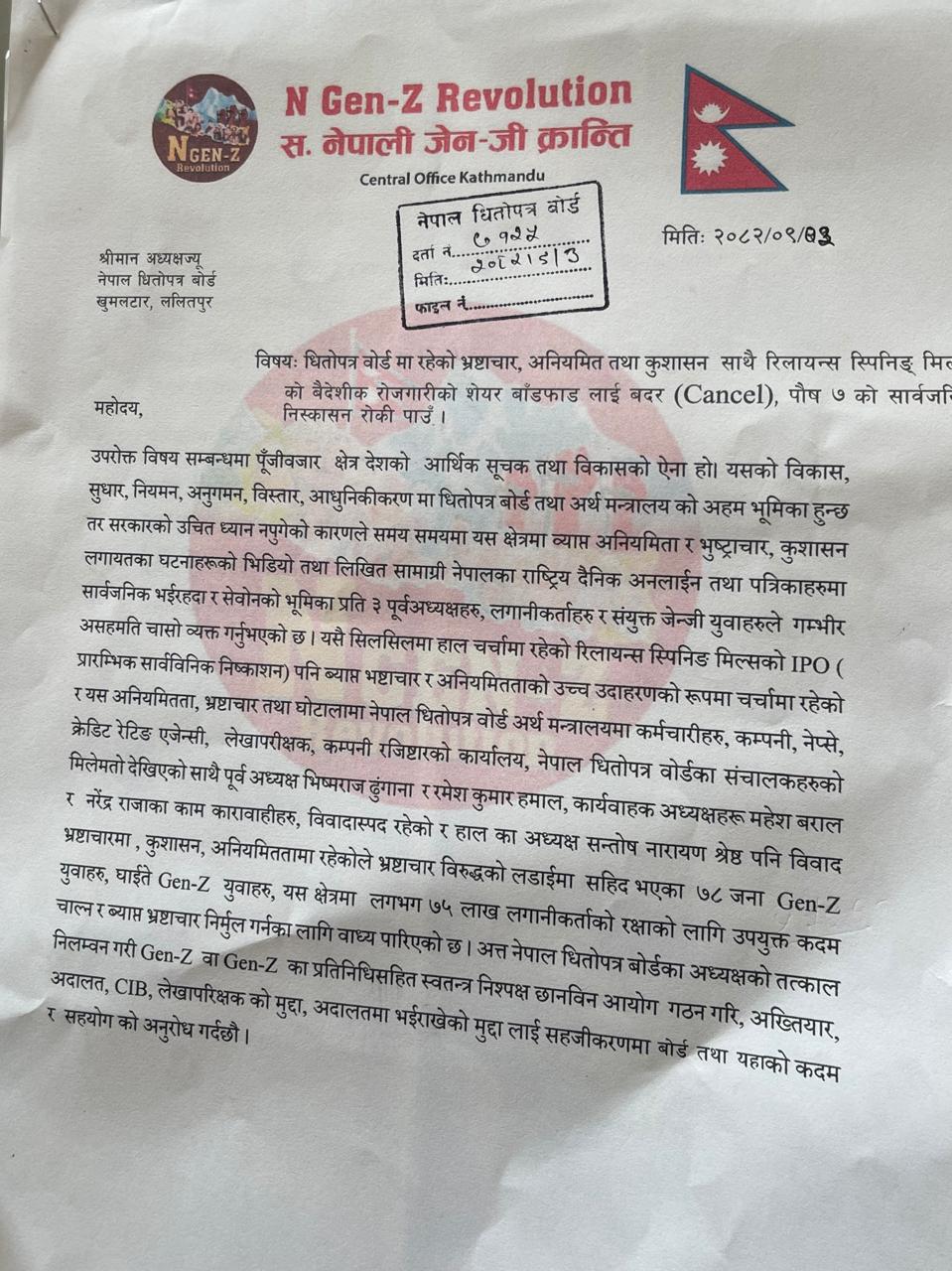 काठमाण्डौ । सेयर बजारका जेनजी लगानीकर्ताले पूँजीबजारको प्रमुख नियामक नेपाल धितोपत्र बोर्ड(सेबोन)मा रिलायन्स स्पिनिङ मिल्सको आईपीओ तत्काल रोक्नुपर्ने र वैदेशिक रोजगारीमा रहेकालाई बाँडफाँड गरिएको आईपीओ पनि रद्द गर्नुपर्ने लगायतका माग राख्दै आफ्नो ज्ञापनपत्र दर्ता गराएका छन् ।