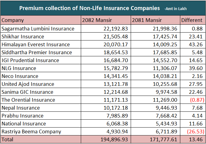 यसका साथै हिमालयन एभरेष्टले २ अर्ब, सिद्धार्थ प्रिमियरले १ अर्ब ८६ करोड, आइजीआई प्रुडेन्सियलले १ अर्ब ६६ करोड, एनएलजीले १ अर्ब ५७ करोड, नेको इन्स्योरेन्सले १ अर्ब ४३ करोड, युनाइटेड अजोडले १ अर्ब ३१ करोड, सानिमा जिआइसीले १ अर्ब २२ करोड, ओरियन्टल इन्स्योरेन्सले १ अर्ब ११ करोड, नेपाल इन्स्योरेन्सले १ अर्ब १ करोड, प्रभु इन्स्योरेन्सले ७९ करोड ८५ लाख, नेशनल इन्स्योरेन्सले ६० करोड ६८ लाख र राष्ट्रिय बीमा कम्पनीले ४९ करोड ३० लाख रुपैयाँ प्रिमियम संकलन गरेका छन् ।