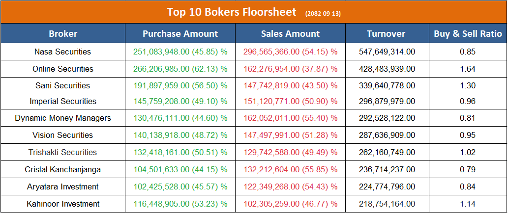 त्यस्तै, उच्च बिक्री गर्ने ब्रोकरहरुमा नासा सेक्युरिटिज, इम्पेरियल सेक्युरिटिज, डायनामिक मनि म्यानेजर्स, भिजन सेक्युरिटिज, क्रिष्टल कंचनजंगा सेक्युरिटिज र आर्यतारा इन्भेष्टमेन्ट एण्ड सेक्युरिटिज रहेका छन् ।