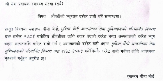 स्वास्थ्य बीमा बोर्डद्वारा औषधि दररेटसम्बन्धी यस्तो निर्देशन जारी