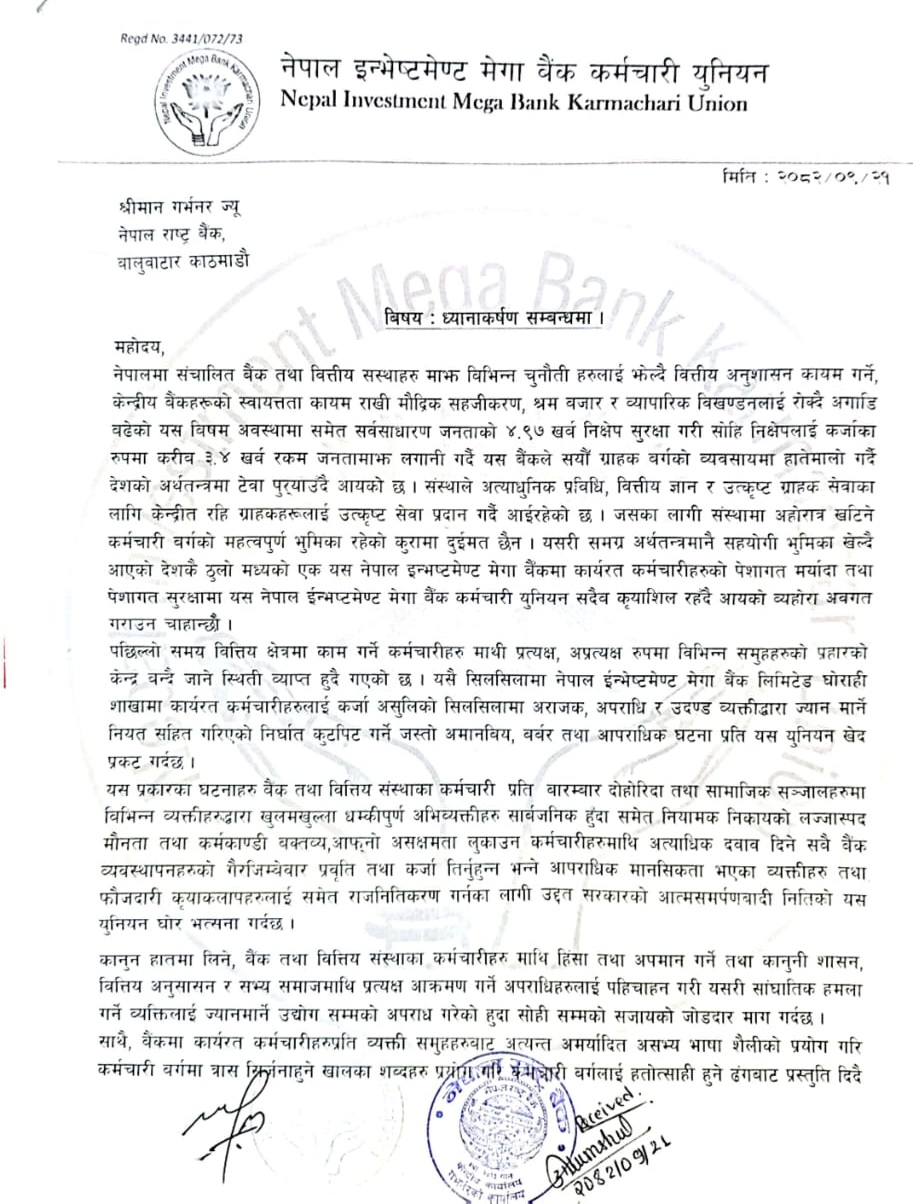 काठमाण्डौ ।  नेपाल इन्भेष्टमेन्ट मेगा बैंकका कर्मचारीहरूले कर्जा असुलीको क्रममा बारम्बार दुर्व्यवहार र कुटपिटको सामना गर्नुपरेपछि कर्मचारी युनियनले नेपाल राष्ट्र बैंकका गभर्नरलाई कडा ध्यानाकर्षण पत्र बुझाएको छ।