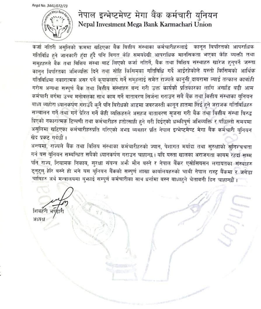 युनियनले केन्द्रीय बैंकलाई बुझाएको पत्र यस्तो छः