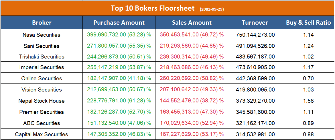 उच्च खरिद गर्ने ब्रोकरहरुमा नासा सेक्युरिटिज, सनि सेक्युरिटिज, त्रिशक्ति सेक्युरिटिज, इम्पेरियल सेक्युरिटिज, भिजन सेक्युरिटिज, नेपाल स्टक हाउस र प्रिमियर सेक्युरिटिज रहेका छन् ।