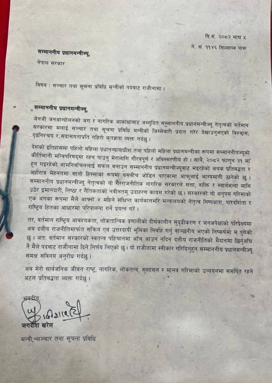 काठमाण्डौ । काठमाण्डौ । सञ्चार, सूचना तथा प्रविधिमन्त्री जगदीश खरेलले मन्त्री पदबाट अलग भएका छन् । आगामी प्रतिनिधिसभा निर्वाचनमा राष्ट्रिय स्वतन्त्र पार्टी (रास्वपा)को तर्फबाट उम्मेदवार बन्ने निश्चित भएपछि उनले सरकारबाट बाहिरिने निर्णय गरेका हुन् ।