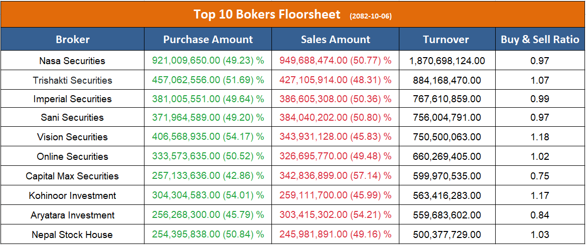 त्यस्तै, उच्च बिक्री गर्ने ब्रोकरहरुमा नासा सेक्युरिटिज, इम्पेरियल सेक्युरिटिज, सनि सेक्युरिटिज, क्यापिटल म्याक्स सेक्युरिटिज र आर्यतारा इन्भेष्टमेन्ट एण्ड सेक्युरिटिज रहेका छन् ।