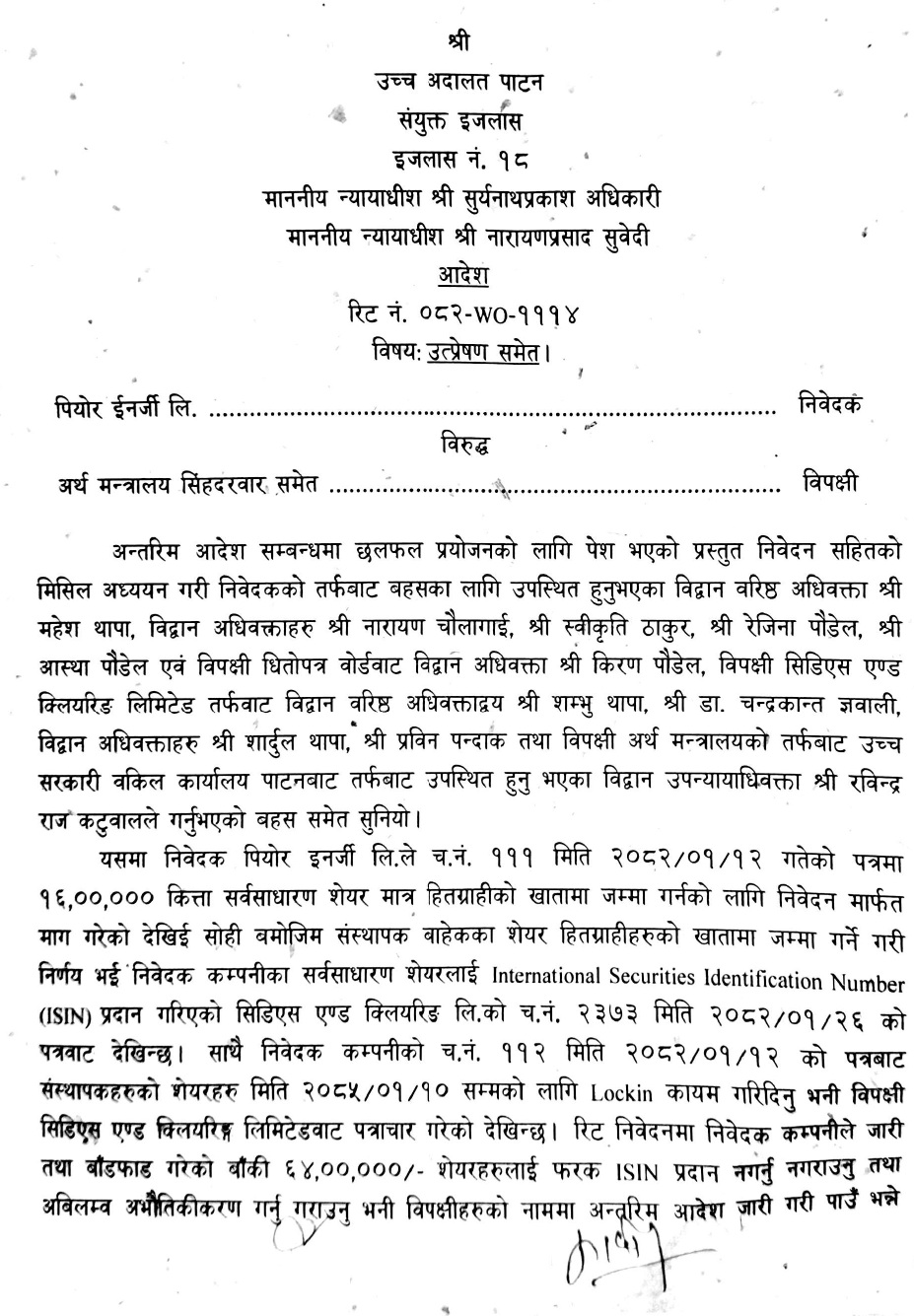 पियोर इनर्जीले अर्थमन्त्रालयसहितका सरकारी निकायहरुलाई विपक्षी बनाई रिट दायर गरेको थियो । जसमा सो कम्पनीले सर्वसाधारणलाई बिक्री गरिएको १६ लाख कित्ताबाहेक संस्थापकको नाममा रहेको ६४ लाख कित्ता सेयरलाई फरक आईजीन प्रयोग नगर्न नगराउन तथा अबिलम्ब अभौतिकीकरण गर्नु गराउनु भनी विपक्षीहरुको नाममा अन्तरिम आदेश जारी गर्न माग गरेको थियो । पियोर इनर्जीको तर्फबाट यस्तो माग गरिनुको सोझो अर्थ थियो ६४ लाख कित्ता संस्थापक सेयरको लकइन अवधि २०८५ बैशाख १० गते सकिए पनि त्यसभन्दा अगाडि नै एउटै आईजीनको व्यवस्थाको दुरुपयोग गर्दै बजारमा बिक्री गर्नु र मूल्य बढेको बेला सर्वसाधारणको टाउकोमा ६४ लाख कित्ता थोपरेर आफू कुस्त कमाउनू भन्ने नै देखिन्छ । पियोर इनर्जीको यही प्रयासमा अदालतले ब्रेक लगाइदिएको हो ।
