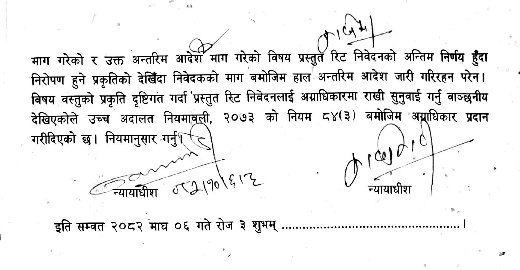 अदालतले उक्त अन्तरिम आदेश माग गरेको विषय प्रस्तुत रिट निवेदकको अन्तिम निर्णय हुँदा निरोपण हुने प्रकृतिको देखिँदा निवेदकको माग बमोजिम हाल अन्तरिम आदेश जारी गरिरहन नपरेको समेत प्रष्ट पारेको छ ।
