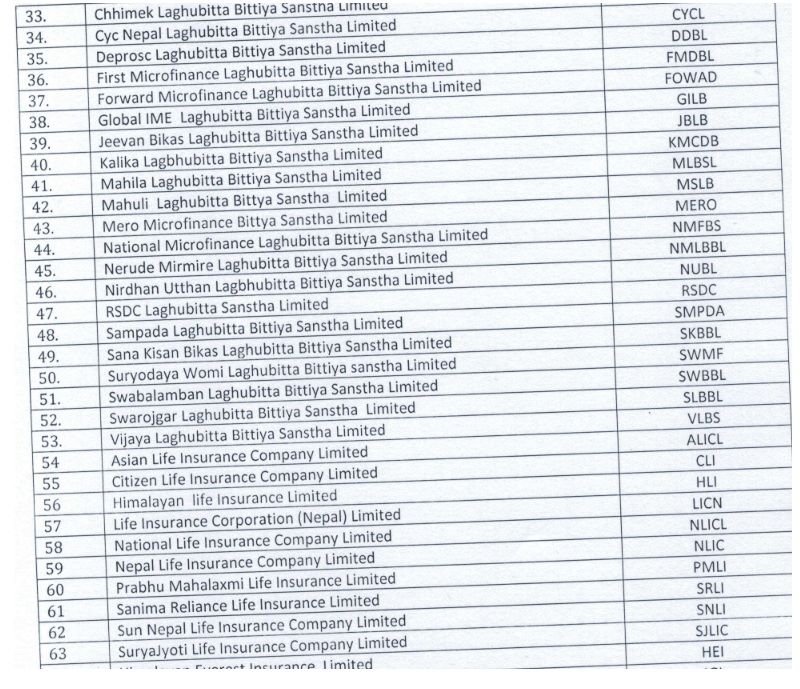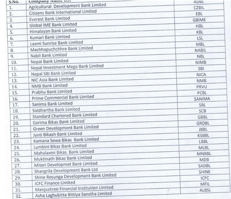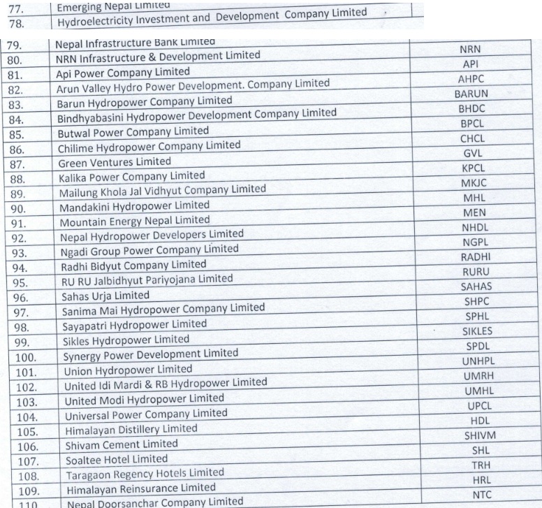 नेप्सेद्वारा सार्वजनिक गरिएको सूचीमा १९ वटा सूचीकृत वाणिज्य बैंक १० वटा विकास बैंक, २ वटा फाइनान्स, २२ वटा लघुवित्त, १० वटा जीवन बीमा, ११ वटा निर्जीवन बीमा, ६ वटा लगानी कम्पनी, २४ वटा हाईड्रो कम्पनी, २ वटा उत्पादन तथा प्रशोधन, २ वटा होटल तथा टुरिजम र २ वटा अन्य गरी कुल ११० वटा कम्पनीको सूची सार्वजनिक गरिएको छ ।