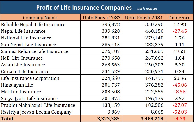 यसका साथै नेशनल लाइफले २८ करोड ६८ लाख, सन नेपाल लाइफले २८ करोड ५४ लाख, सानिमा रिलायन्स लाइफले २७ करोड ६१ लाख, , आइएमई लाइफले २७ करोड ६ लाख, एशियन लाइफले २६ करोड ३५ लाख, सिटिजन लाइफले २२ करोड ४५ लाख, हिमालयन लाइफले २० करोड ६७ लाख, मेट लाइफले २० करोड ३५ लाख, सूर्यज्योति लाइफले २० करोड १८ लाख, प्रभु महालक्ष्मी लाइफले १३ करोड ३१ लाख रुपैयाँ र राष्ट्रिय जीवन बीमा कम्पनीले ३८ लाख रुपैयाँ मात्रै नाफा कमाएको छ ।