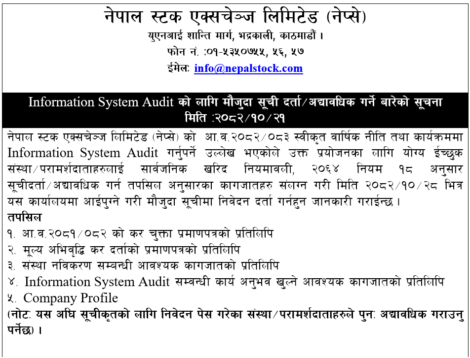 हालै नेपाल स्टक एक्सचेञ्ज लिमिटेड (नेप्से) ले सूचना प्रणाली (Information System) अडिटका लागि संस्था/परामर्शदातालाई सूची दर्ता/अद्यावधिक गर्न सूचना प्रकाशित गरेको छ। नेप्सेको संवेदनशील कारोबार तथा सूचना प्रविधि प्रणाली अडिटको पहल हुनु स्वागतयोग्य कदम भए पनि प्रकाशित सूचनामा अडिटरको आवश्यक योग्यता, अनुभव, कार्यक्षेत्र र स्पष्ट मापदण्ड उल्लेख नहुनुले गम्भीर प्रश्न उठाएको छ।