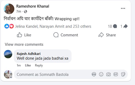 उनको पोस्टमा कमेन्ट गर्ने धेरैले निर्वाचन सफलतापूर्वक सम्पन्न गर्न लागेकोले बधाई दिएका छन् ।