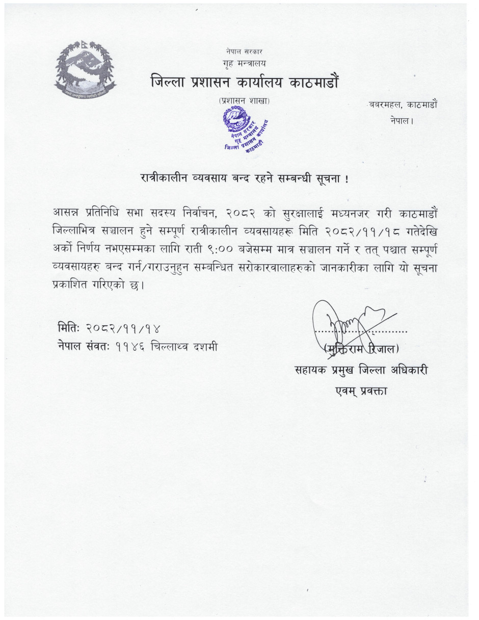 कार्यालयद्वारा जारी सूचनाअनुसार मिति २०८२ फागुन १८ गतेदेखि अर्को निर्णय नभएसम्मका लागि सबै प्रकारका रात्रीकालीन व्यवसायहरू राति ९ बजेसम्म मात्र सञ्चालन गर्न पाइनेछ। उक्त समयपछि सम्पूर्ण व्यवसाय बन्द गर्न तथा गराउन सम्बन्धित सरोकारवालाहरूलाई निर्देशन दिइएको छ।
