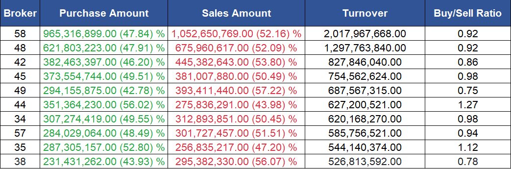उच्च खरिद गर्ने ब्रोकरहरुमा डायनामिक मनि म्यानेजर्स र कोहीनूर इन्भेष्टमेन्ट एण्ड सेक्युरिटिज रहेका छन् ।
