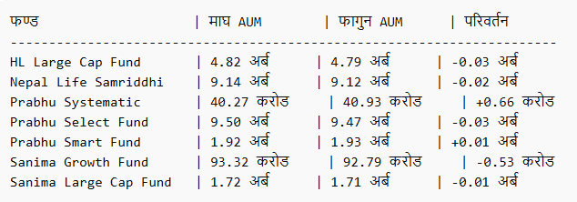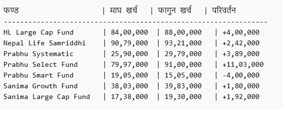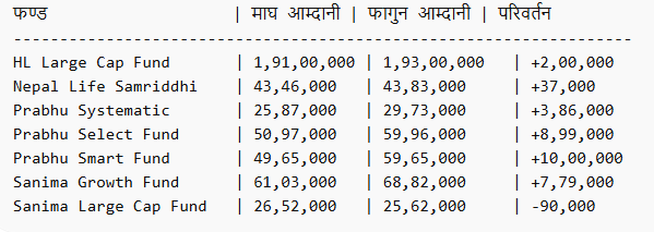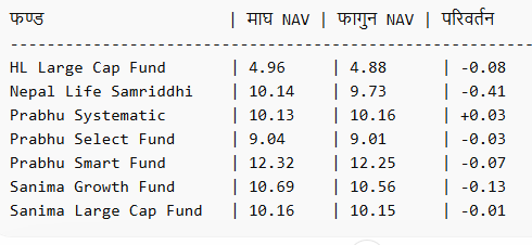माघ मसान्तसँग तुलना गर्दा केही योजनाको प्रति इकाई खुद सम्पत्ति मूल्य (NAV) सुधारिएको देखिन्छ भने केहीमा भने गिरावट वा स्थिरता कायम रहेको छ।