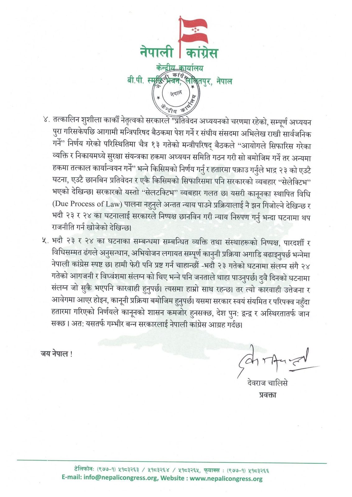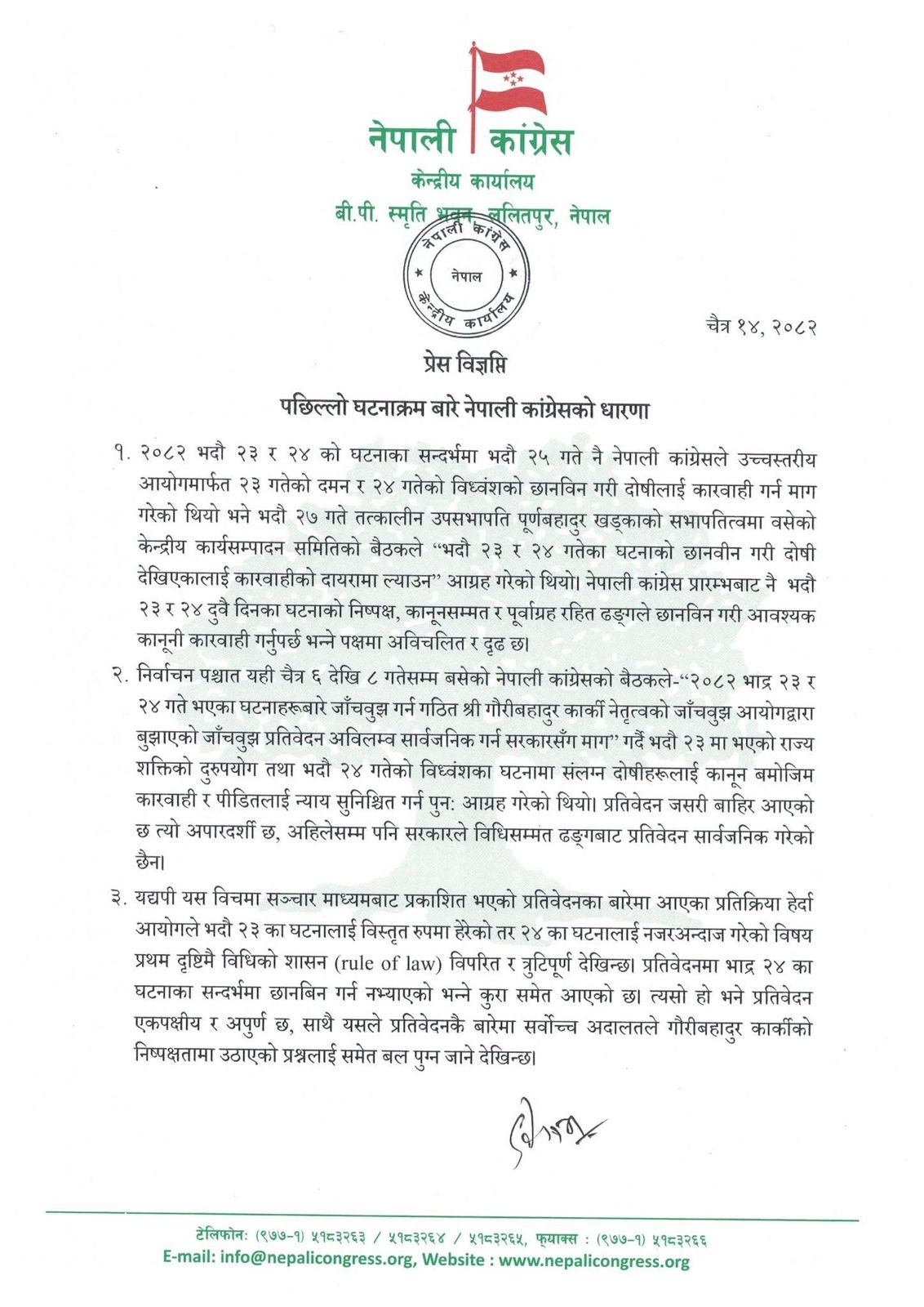 विज्ञप्तिमा २०८२ भदौ २३ र २४ गतेका घटनाबारे छानबिन गर्न गठित गौरिबहादुर कार्की नेतृत्वको आयोगको प्रतिवेदन निष्पक्ष रूपमा कार्यान्वयन हुनुपर्नेमा जोड दिइएको छ। कांग्रेसले उक्त प्रतिवेदन सार्वजनिक गर्न, दोषी पहिचान गरी कानुनअनुसार कारबाही गर्न र पीडितलाई न्याय दिन सरकारसँग माग दोहोर्‍याएको छ।