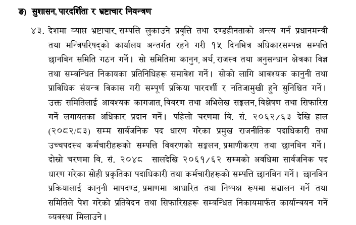 उक्त समितिले राजनीतिक पदाधिकारीदेखि उच्च तहका कर्मचारीसम्मको सम्पत्ति विवरणको अध्ययन तथा छानबिन गर्नेछ। निर्णयअनुसार पहिलो चरणमा २०६२–६३ पछिको अवधिमा सार्वजनिक पद धारण गरेका व्यक्तिहरूको सम्पत्ति जाँचिनेछ भने दोस्रो चरणमा २०४८ पछिको अवधिको पनि छानबिन गरिने व्यवस्था गरिएको छ।