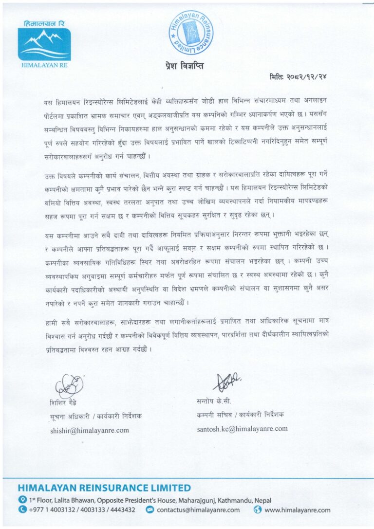 केही मिडियाहरुले हिमालयन-रि समस्याग्रस्त हुँदैछ भनेर लेखेको र त्यसकै आधारमा लगानीकर्ताहरुले धारणा बनाउन थालेपछि फैलिएको भ्रमलाई चिर्न कम्पनीले औपचारिक रुपमा मुख खोलेको हो ।