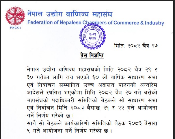 काठमाण्डौ । चैत २९ र ३० गतेका लागि तय गरिएको नेपाल उद्योग वाणिज्य महासंघको साधारणसभा तथा निर्वाचन उच्च अदालत पाटनको अन्तरिम आदेशका कारण स्थगित भएपछि नयाँ मिति तोकिएको छ।