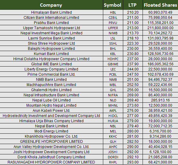 बजारमा यतिबेला ३० कम्पनीको सेयरभाउ ३ सय रुपैयाँभन्दा कम छ । त्यसमा केही नयाँ कम्पनी पनि रहेका छन् भने अधिकांश पुराना हाइड्रो सेक्टर र बैंकिङ सेक्टरका कम्पनीहरु छन् ।
