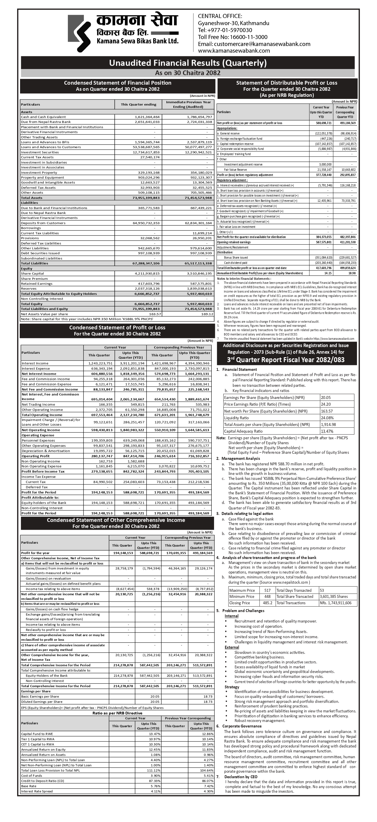समीक्षा अवधिसम्म बैंकको प्रतिसेयर नेटवर्थ १६३.५७ रुपैयाँ, पी/ई रेसियो २४.२० गुणा, तरलता अनुपात २४.०८ प्रतिशत, प्रतिसेयर कुल सम्पत्ति मूल्य १,९१४.९८ रुपैयाँ र पूँजीकोष अनुपात १३.४७ प्रतिशत कायम रहेको छ।